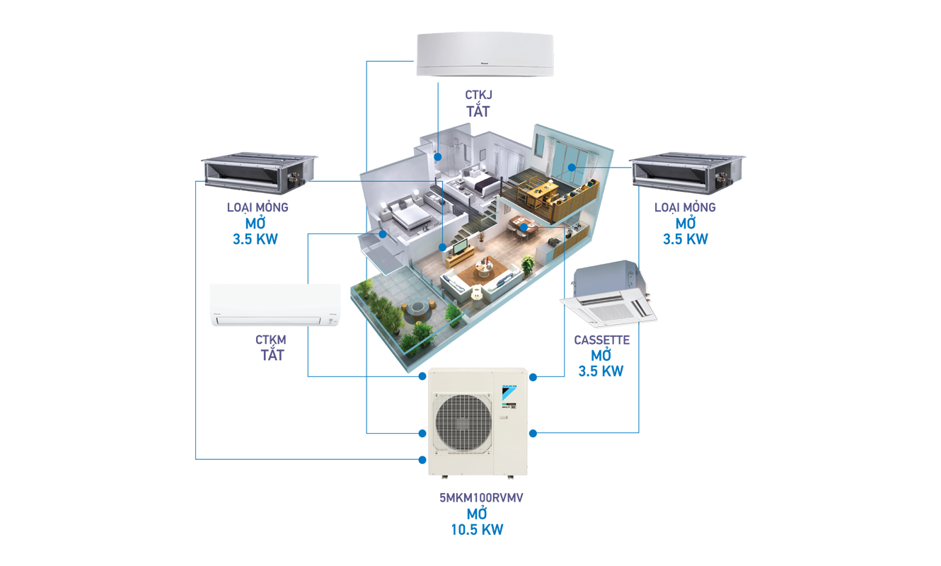 Điều hòa multi LG với công nghệ điều khiển nhiệt độ môi chất lạnh theo nhiệt độ trong phòng, ngoài trời và thiết lập. Tính năng này giúp tối ưu hoá hiệu quả sử dụng năng lượng nhờ tiết kiệm tới 15% và tăng cường tối đa sự thoải mái trong phòng ở các chế độ làm mát/sưởi ấm.