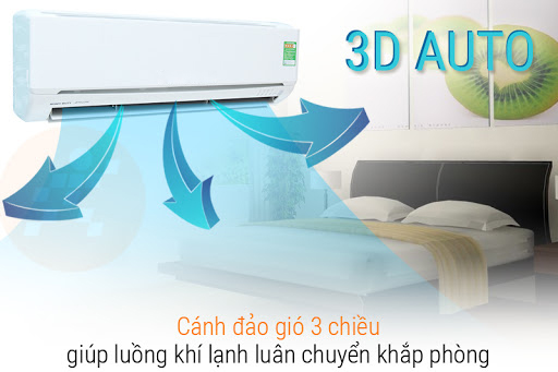 Công nghệ Đảo gió 3D-Auto tự động 4 hướng: lên/xuống/trái/phải, với cánh gió dọc và ngang giúp hơi lạnh được phân phối đều khắp phòng, việc làm lạnh sẽ dễ chịu hơn rất nhiều do gió sẽ ít bị thổi trực tiếp vào cơ thể.